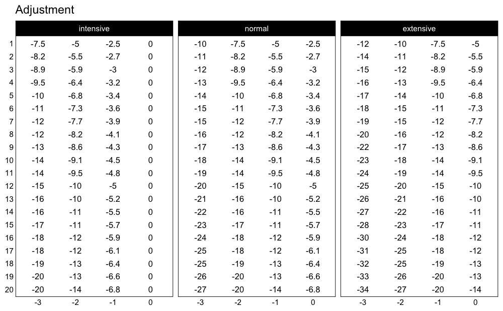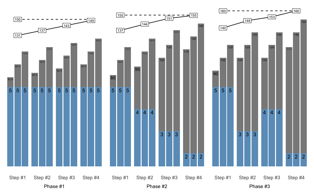 Adjustment method is the main element of the progression table and represents the method for progression (see [Progression] section). Although the adjustment of the %1RM used for the target reps (adj_perc_1RM_ family of functions) is the most common, you can also adjust the reps for target %1RM (adj_reps_ family of functions). Default Reps-Max function used across adjustment functions is the max_perc_1RM_epley(). User is allowed to provide other Reps-Max function as well as custom model parameter value. This is extremely useful in creating individualized progression tables and set and rep schemes.