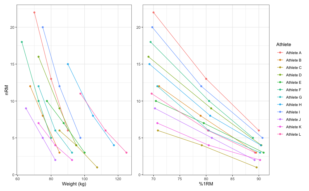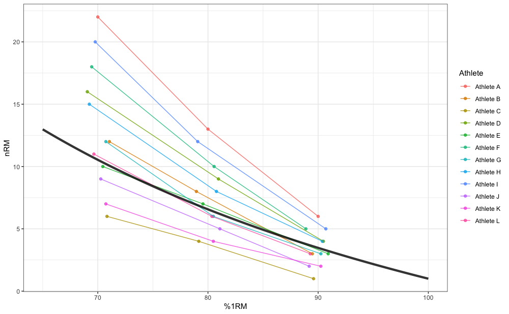 Reps-Max functions start with max_ and allow you to either predict max %1RM from repetitions (start with max_perc_1RM_), or to predict max repetitions (i.e., nRM) from %1RM used (start with max_reps_). Each of Reps-Max functions allow you to use different model parameter values. This is very helpful when using individualized profiles to create set and rep schemes (see Estimation section).