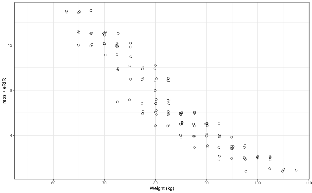 #> [1] 6.4Let’s make this a bit more eye appealing. Here we have plotted the relationship between max reps (RTF; nRM) on x-axis and max %1RM to be used on y-axis: