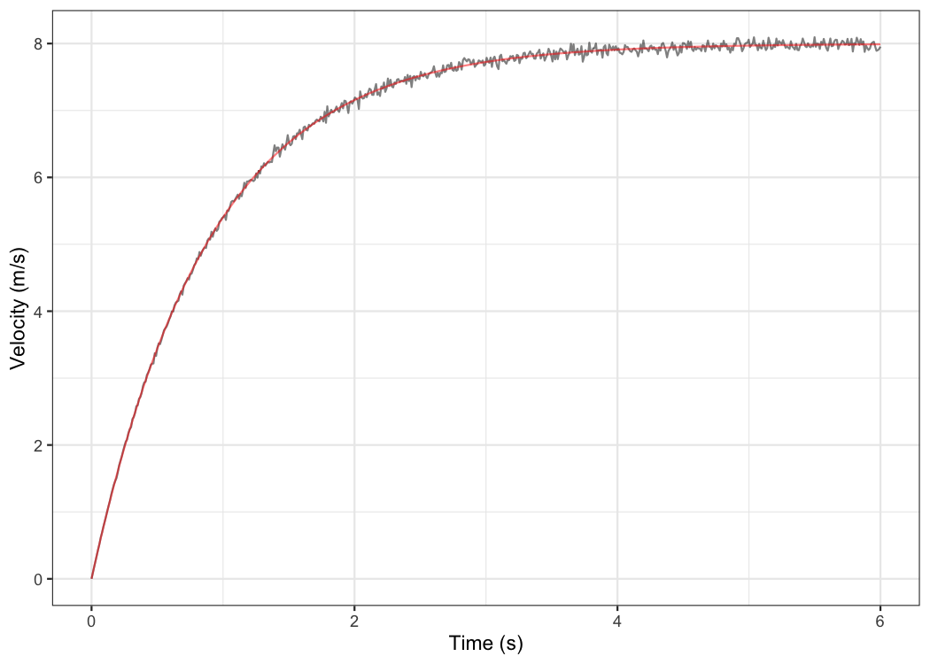ggplot(jim_profile$data, aes(x = time)) + theme_bw() + geom_line(aes(y = velocity), alpha = 0.5) + geom_line(aes(y = pred_velocity), color = "red", alpha = 0.5) + xlab("Time (s)") + ylab("Velocity (m/s)")